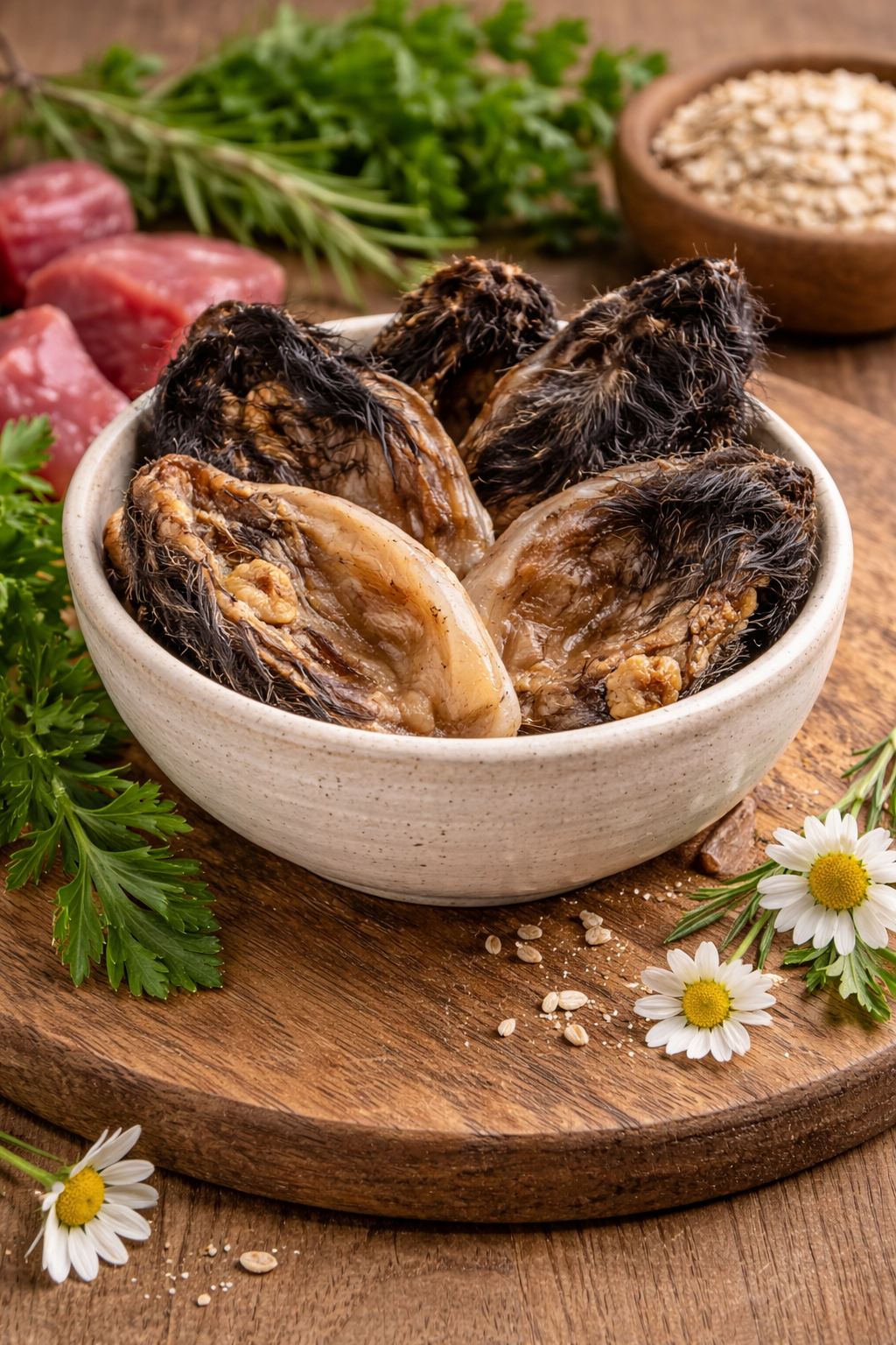 Knabberbar: Rinderohren mit Muschel und Fell